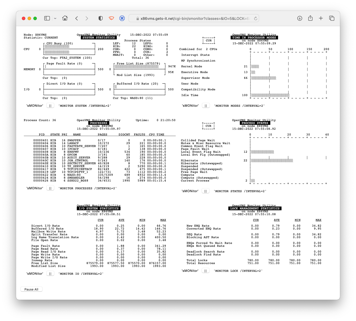 Allows terminal-based application output (e.g. MONITOR utility) to be displayed in a browser page. A CGI script spawns a subprocess to execute supplied DCL command(s) and the subprocess output is captured and converted to HTML, continuously or one-off as required. All example applications require authorisation to activate.